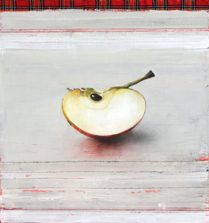 Apfelstueck2017, Acryl, Lack, Stoff, Leinwand, Oel auf Holz130 x 122 cm