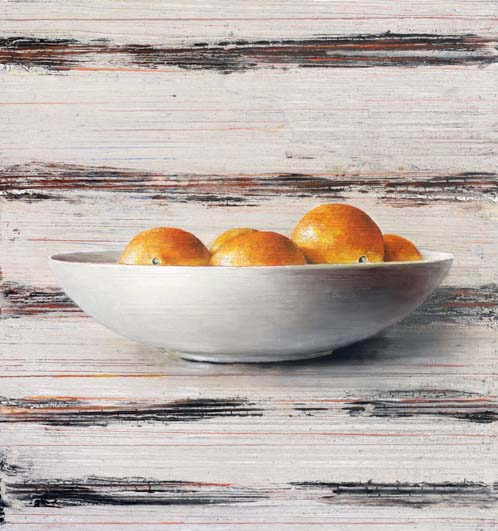 Orangen in weisser Schale2024, Acryl, Lack, Oel auf Holz92 x 86 cm